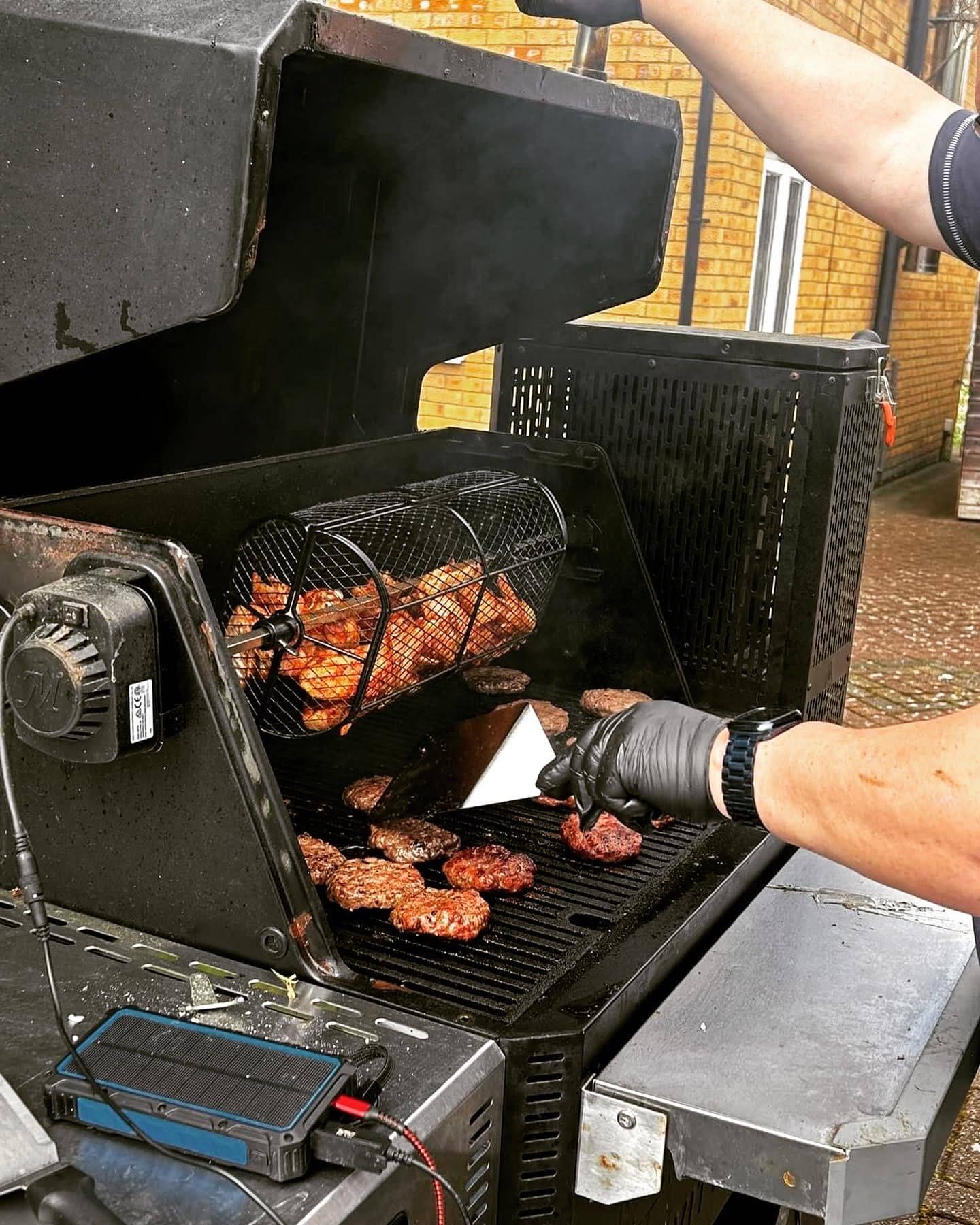 I get some of the wings in the rotisserie basket (fails as the weight is not even) and start getting the burgers on.